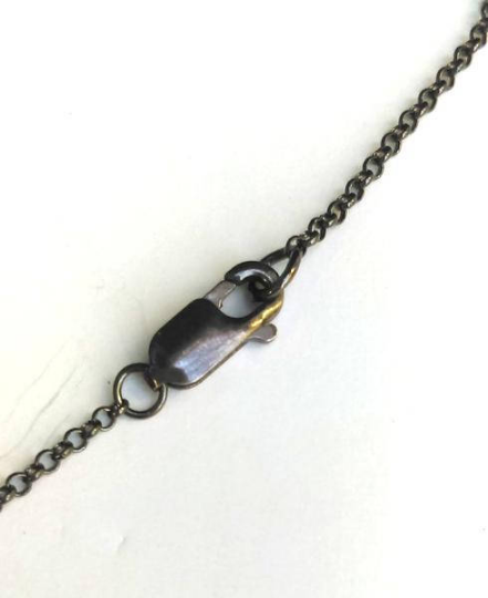 Both witchy and feminine, this necklace is meant to be worn as a little talisman. The natural rosecut aquamarine dangles below the lacy frame. Aquamarine to me is very calming and peaceful. The chain is also sterling silver with a black patina and can be ordered from 16" or 18" and comes with a sturdy lobster clasp. The pendant measures 1" wide by 1" tall