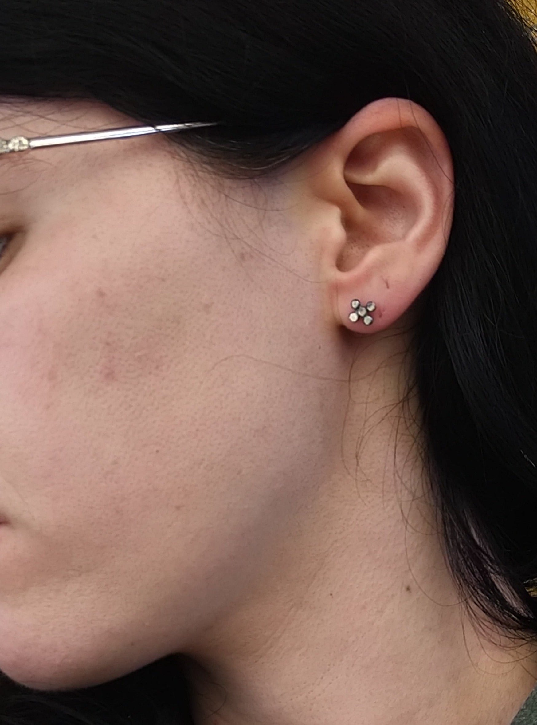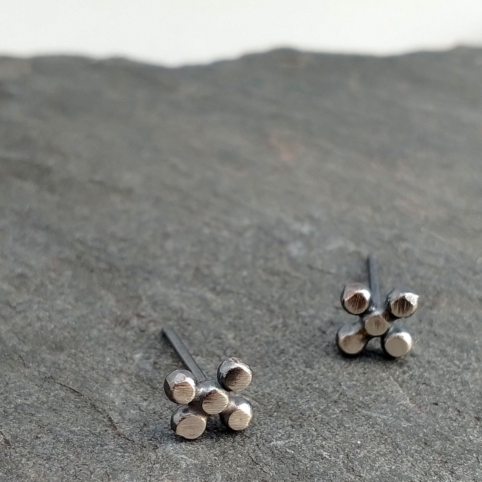 These super easy to wear lightweight posts are formed by creating an x of dots. I love them for the minimalist in your life who loves handmade art without wanting elaborate ornament. They're sterling silver with a black patina, silver posts, and silver ear backs. each one measures 1/4" across. I love that they are geometric in design, yet because each one is made by hand, they are softer and more human.