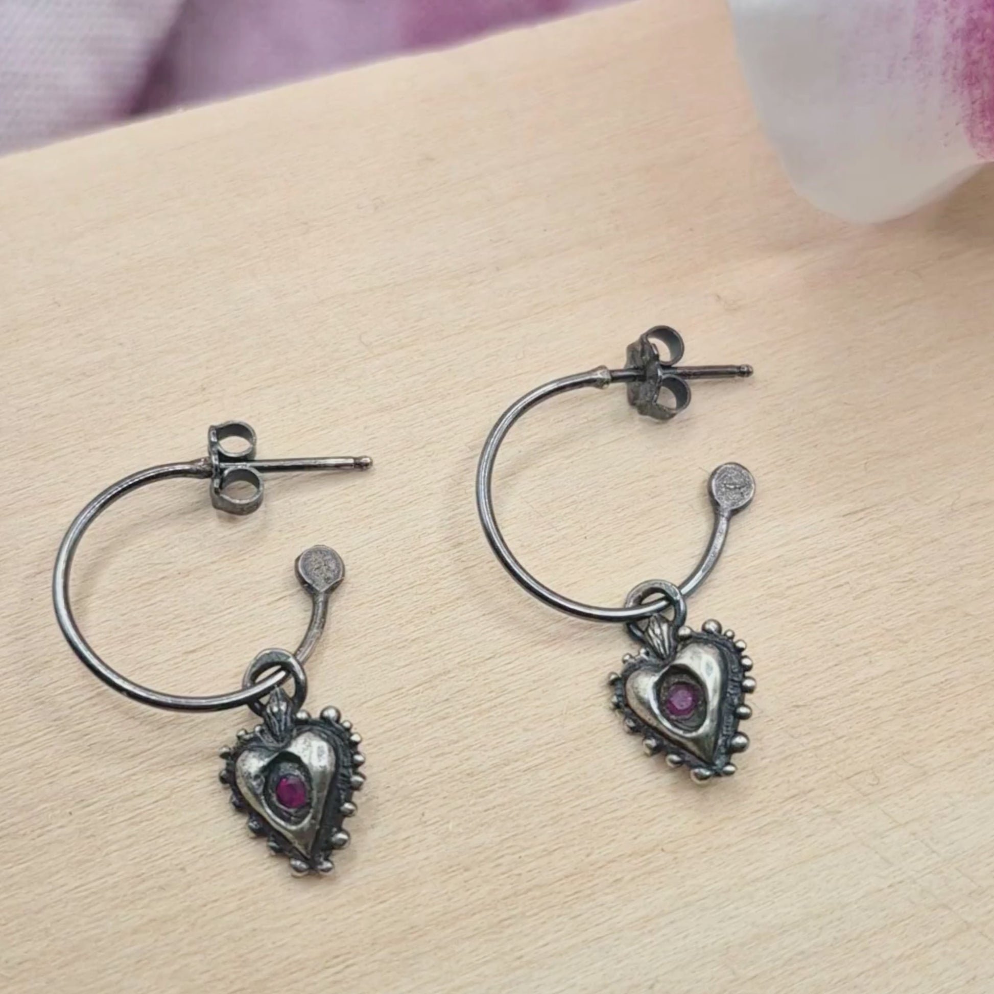 I carved the little hearts in wax and cast them in silver. Inside the hearts, I set 2mm natural rubies. the charms dangle from 1/2" long silver hoop post earrings. They are easy to wear everyday while bringing little reminders of love with you everywhere you go