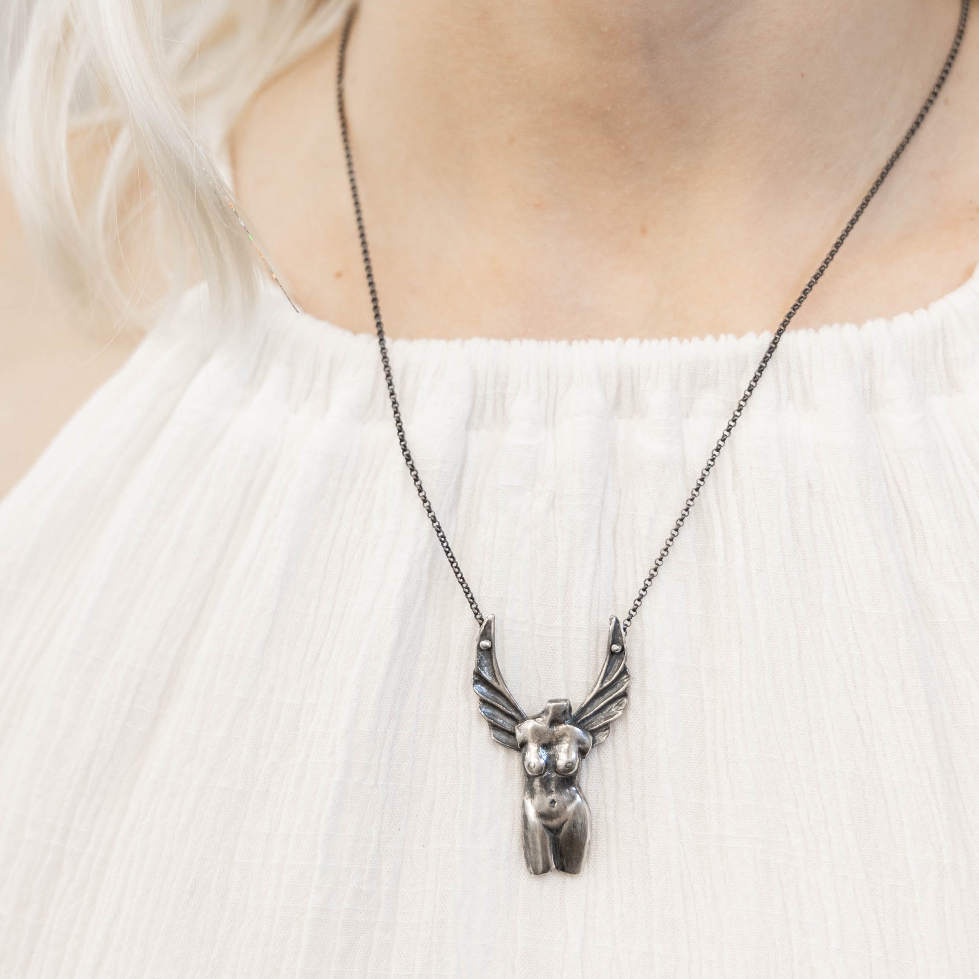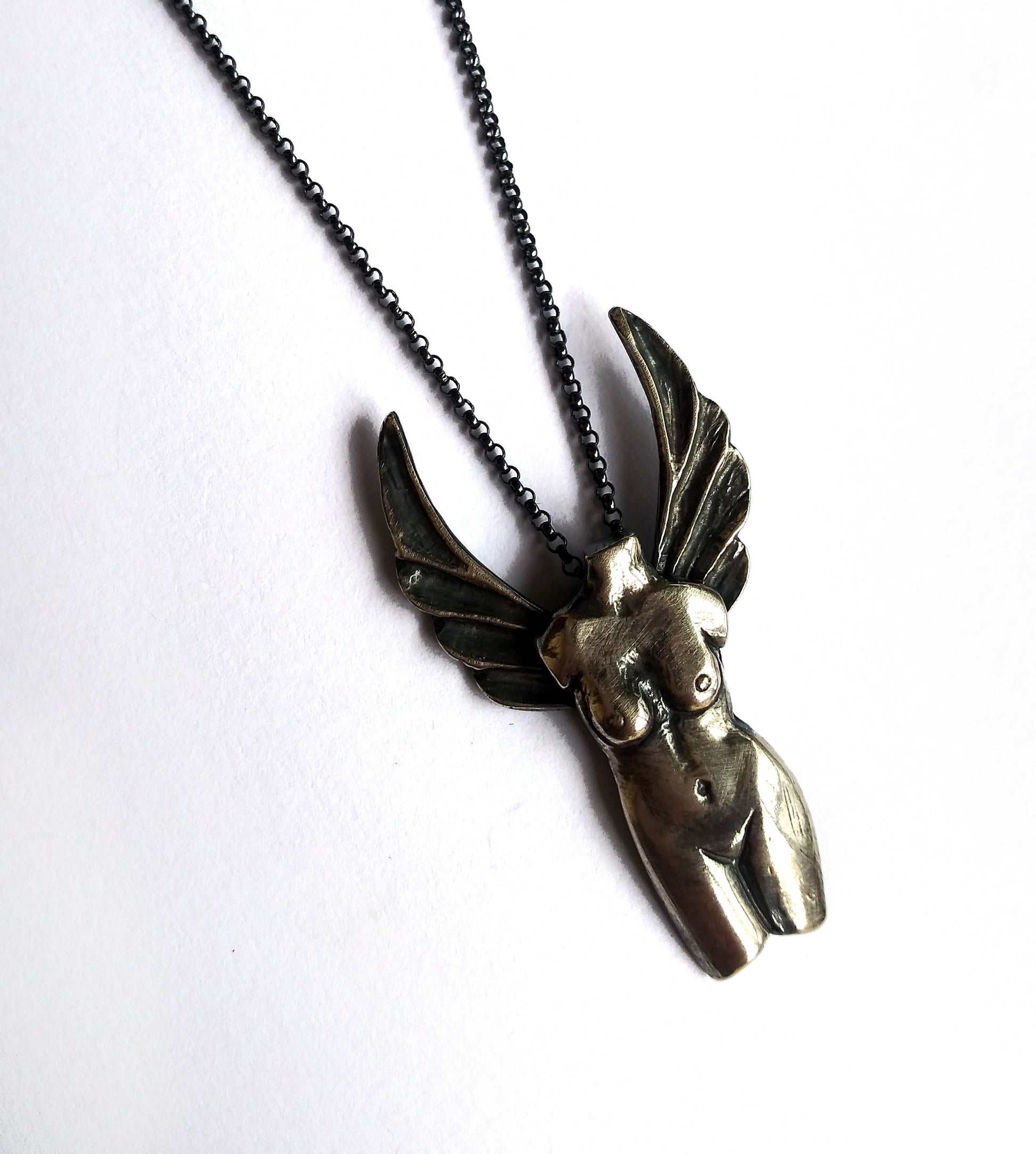 This feminine goddess is hand carved from wax and then cast in silver and accented with hand made silver wings for extra magic. My intention with this piece is to remind you of your own magic divine feminine side, something the world really needs!